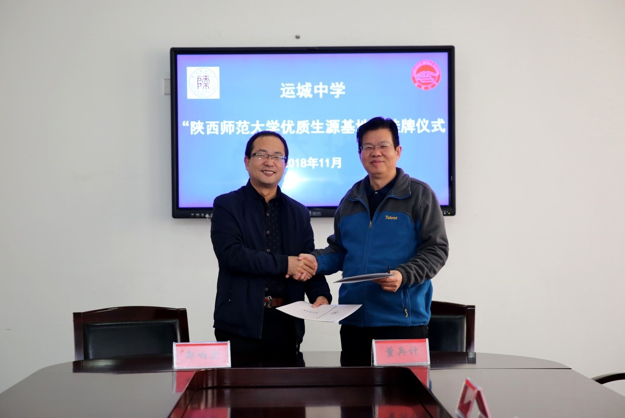 2018年11月20日上午,按照学校2019年招生宣传工作要求和安排,学科建设处副处长、威廉williamhill体育郭响宏副教授、威廉williamhill体育讲师周厚琴博士一行前往山西省运城中学进行陕西师范大学“优质生源基地”座谈、签约和挂牌工作。山西省运城中学校长刘智广、副校长董兵计、教务处副主任白月峰及部分在运城中学工作的师大校友参加了座谈和签约挂牌仪式。会议由运城中学教务处主任李彩娟主持。