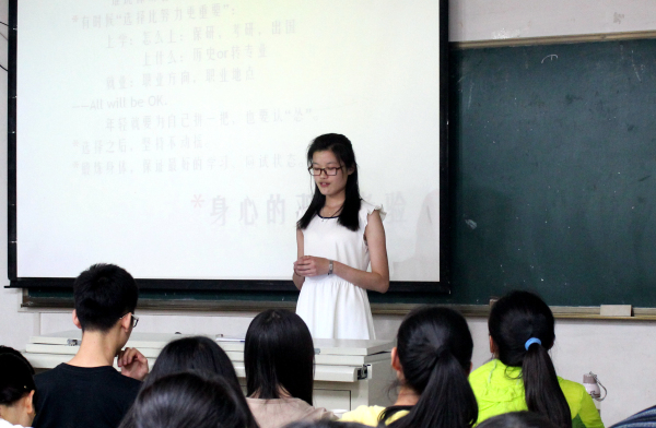 接着,作为即将研究生毕业的刘洁婷老师也与大家交流了自身的一些经验。她说:“不管你是考研还是就业,自己的选择尤为重要,要认清自己,要知道自己究竟想做的事。”刘老师还强调,自身的实力是第一位的,所以作为大三的学生,还可以再为自己的将来做最后的努力。
