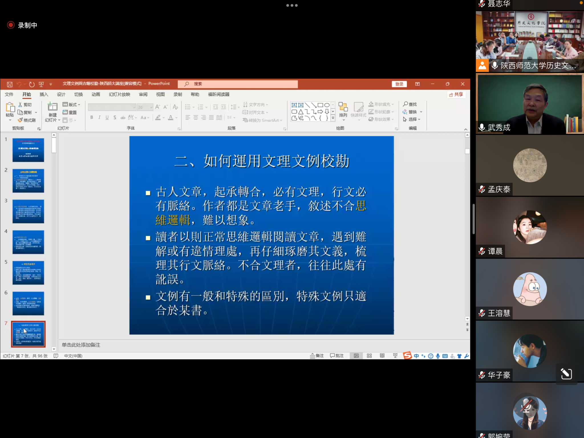 武秀成教授这次展示了六条理校案例,主要是从行文逻辑、文章条例入手,发现问题并解决问题。而准确把握文献的行文逻辑与文章条理,需要深厚的学养。陈垣先生曾指出,理校法高妙而危险,当由“通识者为之”。在这次讲座中,武教授向古籍所师生展现了通识者校勘的精湛境界,令人陶醉、赞叹。