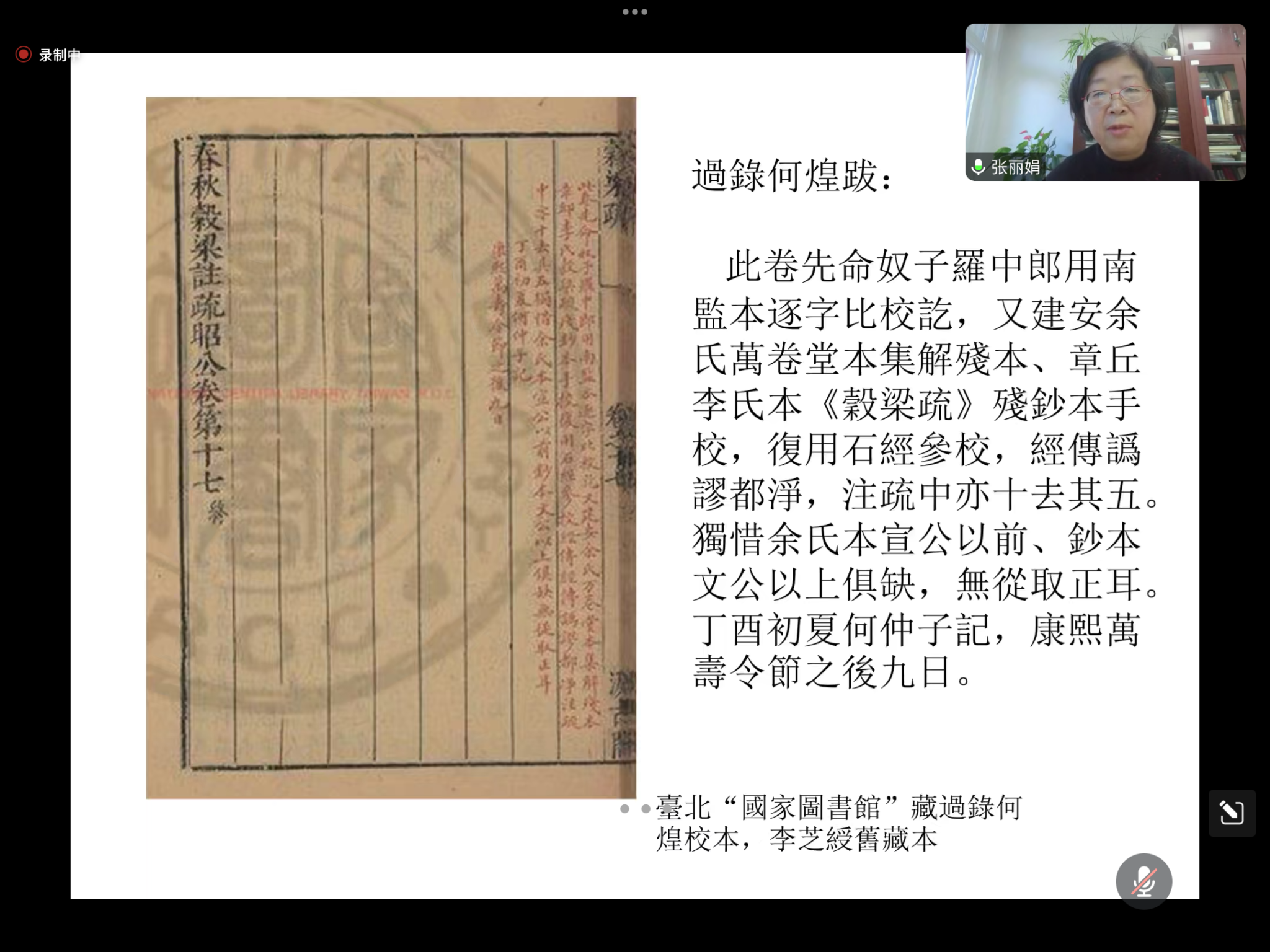 11月17日上午,“威廉williamhill体育所成立40周年系列学术讲座”第五讲在文汇楼C段424会议室举行,讲座采取线上线下结合的方式,北京大学《儒藏》编纂与研究中心张丽娟教授作了题为《单疏本<谷梁疏>在清代的传抄与校勘》的专题报告。学院周晓薇教授、王雪玲教授、郭海文教授、张宗品副教授及我院文献专业研究生、本科生等50余人参加了本次活动。讲座由吕东超副教授主持。