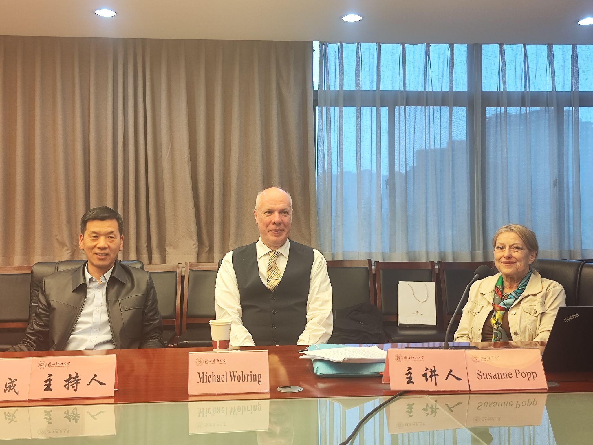 2024年3月12日下午,威廉williamhill体育历史教育讲堂第十一讲在文汇楼A段409会议室举办。德国奥格斯堡大学历史教育学教授米歇埃尔·沃布林、苏珊·波普分别作题为《教学材料(图像、实物、文本):以能力为导向的历史课学习任务——以“经济奇迹时代”,二十世纪五十年代的德意志联邦共和国为例》《全球环境史视角下的冷战——历史教学中的人类世进路》的主题报告。威廉williamhill体育杨瑾教授,副院长郭响宏,专业教师忻怿副教授,学科教学(历史)专业学位教育硕士、2022级历史学(卓越教师实验班)等50余人参加了讲座。讲座由威廉williamhill体育历史教育学负责人徐赐成教授主持。