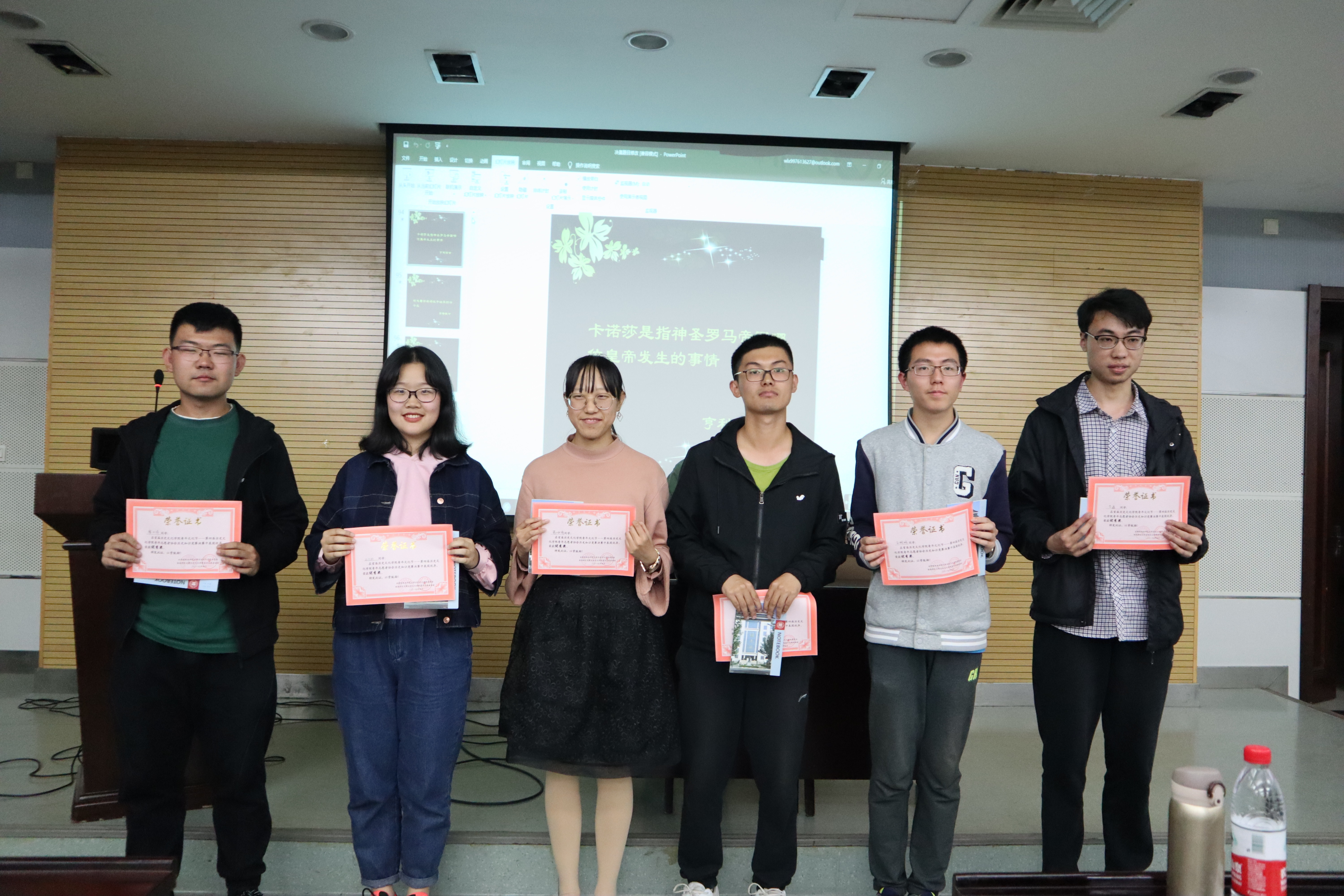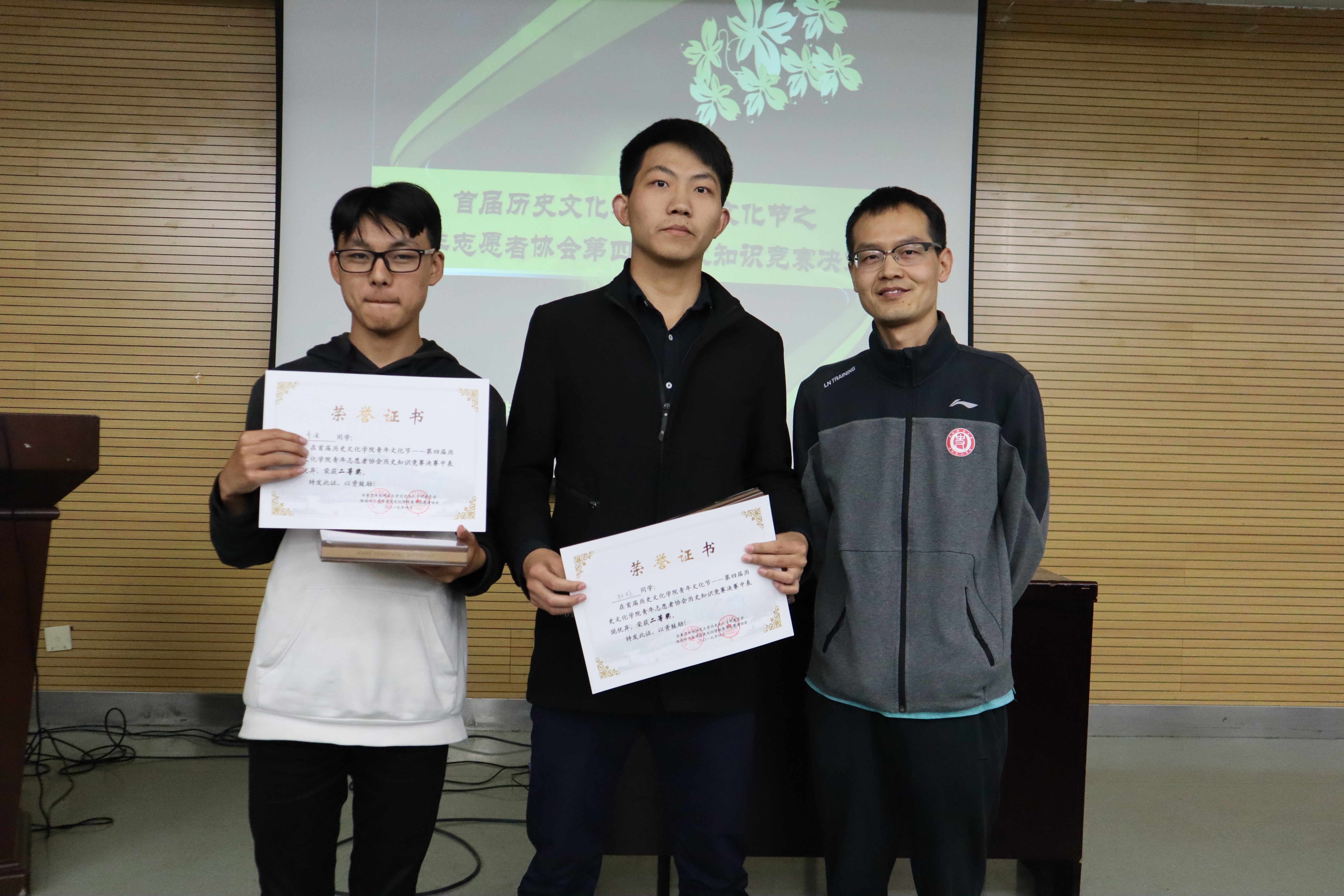 经历初赛的角逐后,共有24名同学进入了决赛。本次竞赛分为三个环节,第一环节为笔试,参赛选手们认真思考,或低头沉思,或胸有成竹,笔试结束后成绩排名前12位的同学进入了第二环节。第二环节为抢答赛,晋级的同学们分成两组依次进行比赛,抢答环节紧张而不失趣味,参赛选手都发挥出自己最好的水平,积极进行抢答,观众们也沉浸于比赛之中,时而鼓掌叫好,时而遗憾叹息,最终有6名同学进入了第三环节——擂台赛。擂台赛由晋级同学两两对决,整场比赛的气氛达到了高潮,最终本次比赛的一等奖由王海啸同学获得,二等奖由杜旺、李俊同学获得,三等奖由周勇琪、马馨玥、张宇航同学获得。王海啸同学还和上一届一等奖得主张泰同学进行了比拼,可谓强强对决,真正展现出历史知识竞赛的魅力。比赛结束后,两位老师对本次比赛进行了点评和总结,并由两位老师向获奖选手颁发了奖品和奖状。
