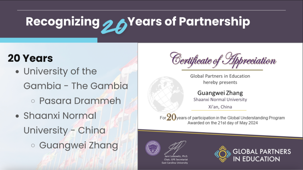 在年会颁奖环节,GPE委员会为我院张光伟老师颁发参与GPE课程二十年特别荣誉,GPE委员会负责人Jami Leibowitz代表GPE对我校以及相关教师长期以来在协会中发挥的重要作用表示了感谢。