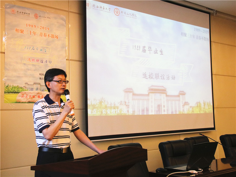 1989届各班代表杨桂萍、齐亚蓉、周永卫分别在会上发言。一班校友杨桂萍讲到,陕西师范大学一大批爱岗敬业,师德高尚堪称楷模的老师以他们的师魂浸染着自己,让自己在30年的教育生涯中越来越热爱着由智慧、情感、信念和理想融汇成的三尺讲台,感谢这讲台的赋予让教育职业生涯有了一种摆脱世俗喧闹的踏实与坦然。30年来,她所带的18届高三年级中,培养出各类状元共8人。她动情的说道,能够在学生们最重要的时刻陪伴他们一起成长,能给如此优秀的年轻生命留下印象,是作为一名教育工作者最大的幸福。而这种坚持,这些力量,是陕西师范大学给她的,是师大的陶冶激励着她不断追求一种有价值的教育人生!二班校友齐亚蓉在感怀母校的诗句中提到:“教学大楼的灯光映照着青春的脸庞,图书馆里的墨香熏陶着年少的心房,联合教室的舞台上你方唱罢我登场,大操场的梧桐下海誓山盟荡气回肠。我们的好时光。渗入母校的土壤,沿着图书馆的墙壁蔓延,攀爬,向上” 。三班校友周永卫讲道:母校在他心目中是真善美的化身;母校四年的求学经历是他终生的宝贵财富;他愿意为母校的发展尽自己的绵薄之力。