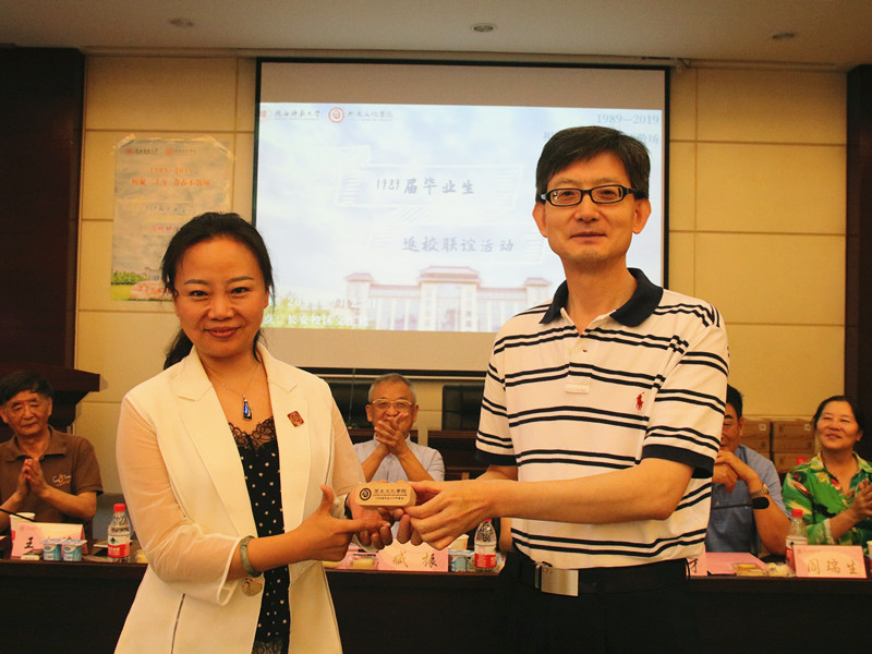 何志龙院长代表学院向89届校友赠送篆刻着每一位校友名字的檀木姓名章,它蕴含着自由、自信、自尊、自强的学院精神,更是寄托了对校友们的牵挂之情,无论大家身在何处,他的名字母院都会牢牢铭记。同时,89届校友也向学院送上了一份承载着厚重历史积淀,带有祥云图文的学院石,表达了同学们对学院满满的感恩之情和浓浓的祝福之意。