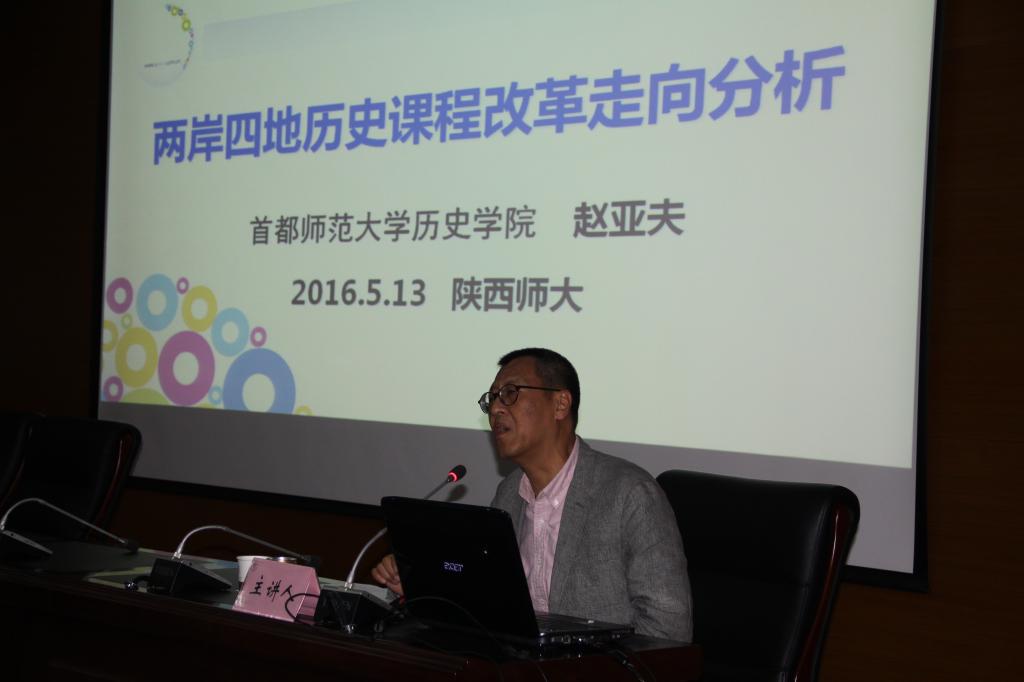 5月13日下午,曲江学者学术报告在长安校区文汇楼C段211学术报告厅举行。我校曲江学者和兼职教授,著名历史教育学家赵亚夫先生做了 “两岸四地历史课程改革走向分析”的专题讲座。讲座由我院兼职教授,著名历史特级教师郭富斌主持。《中学历史教学参考》杂志社主编任鹏杰、我院副教授徐赐成,西安中学、西安铁一中学、西安电子科技大学附属中学、西安曲江中学的十余位历史教师以及我院一百余名师生共同聆听了讲座。