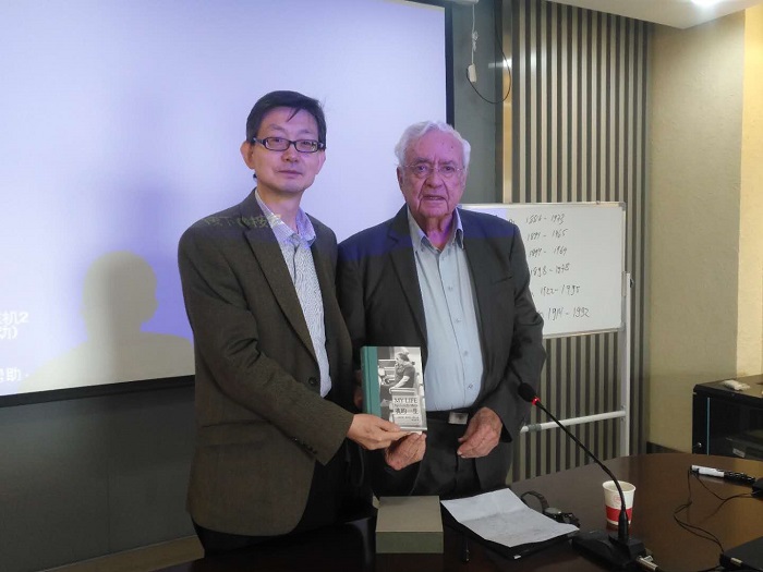 在座谈会之前,何志龙教授为梅龙·梅德奇尼教授赠送以色列前总理果尔达·梅厄夫人所著《我的一生:梅厄夫人自传》中译本。梅龙·梅德奇尼教授系耶路撒冷希伯来大学教授、哈佛大学博士,主要研究方向为现代以色列与远东史,当前主要研究东亚与东南亚的犹太社团,曾担任以色列总理发言人长达15年,熟悉并多次参与以色列国内外政策的制定。