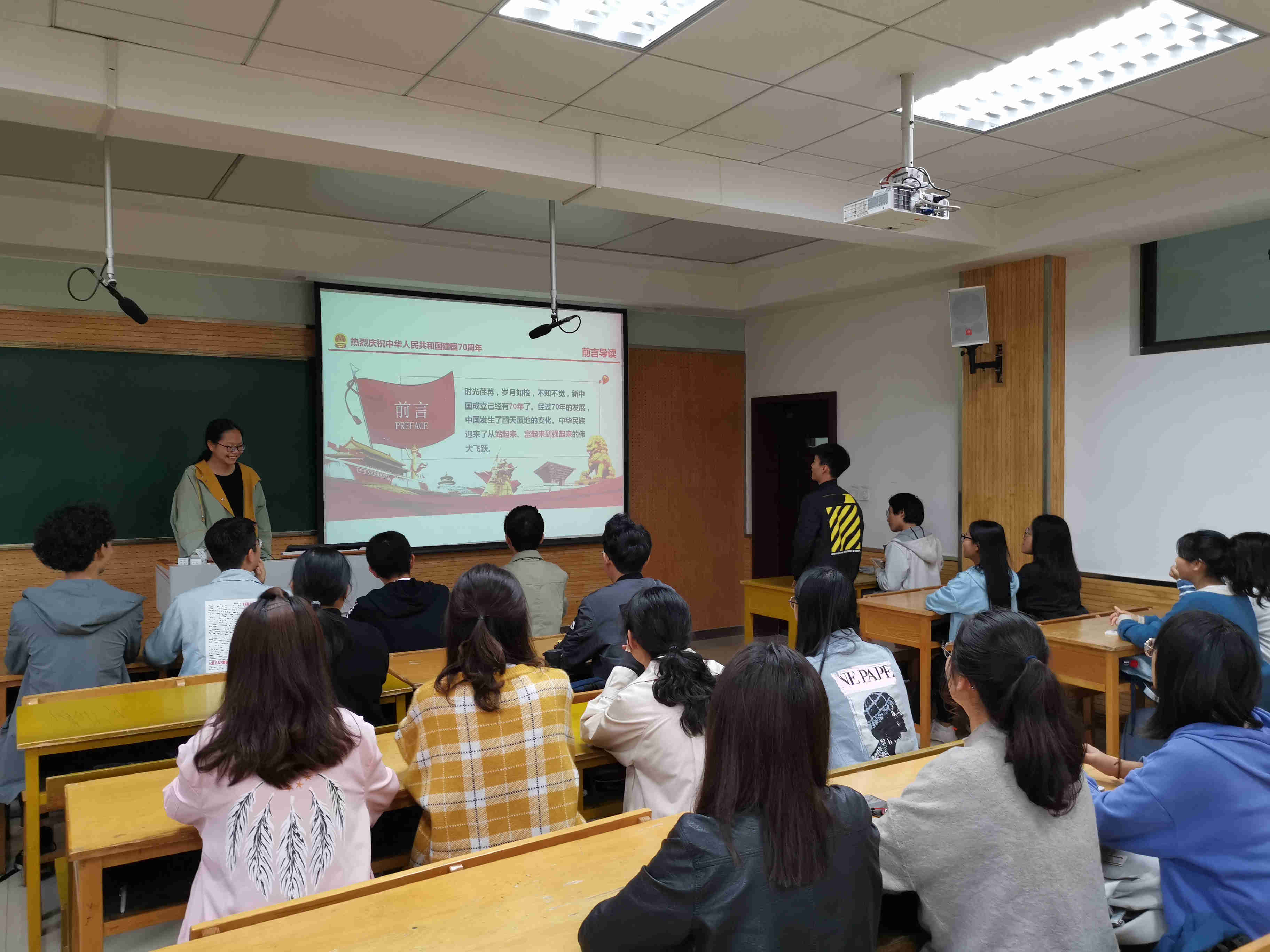 2019级历史学一班团支部的朗诵会,由周云泽同学带领大家回顾了新中国波澜壮阔的70年历程,同学们积极发言,热血沸腾。朗诵会分为集体朗诵和个人朗诵两部分。集体朗诵的内容为《透过历史的眼眸》,个人朗诵的内容为《沁园春•建国70周年颂》和《满江红•七十华诞颂》。通过朗诵,同学们抒发了满腔的爱国情怀。现场氛围浓厚。