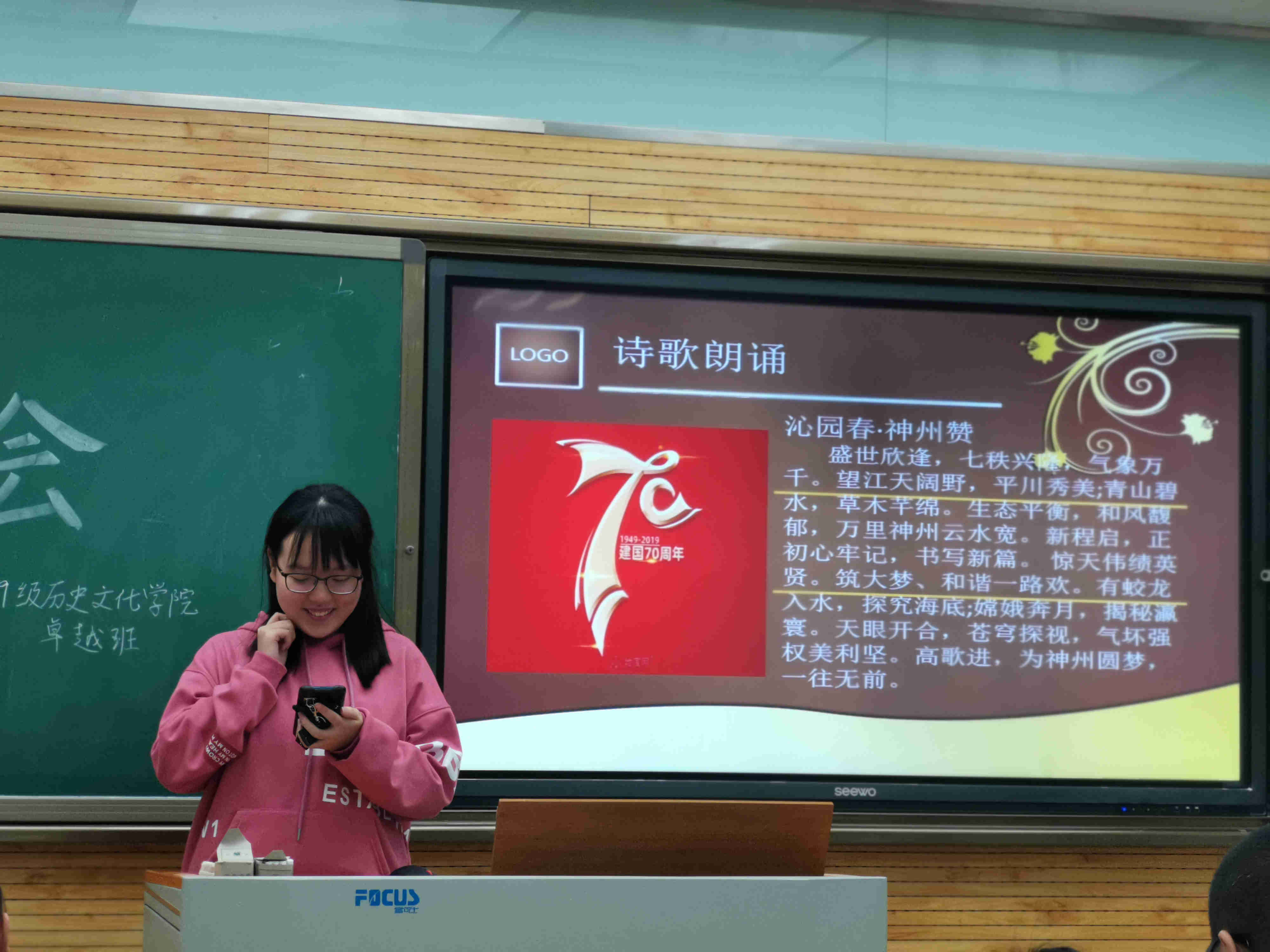 2019级历史学类非师一班团支部的朗诵会,闻桥妍同学首先展示了自己整理的中华人民共和国成立七十年来取得的各项成绩,并表达了自己身为中国人的自豪之情;其次,农杰同学讲述了自己看到的国家的变化,并朗诵了《把祖国搂进明月》,将自己对祖国的感情深深融入这首诗中。最后,以王思哲同学的朗诵《我骄傲,因为我是中国人》为朗诵会的结尾。