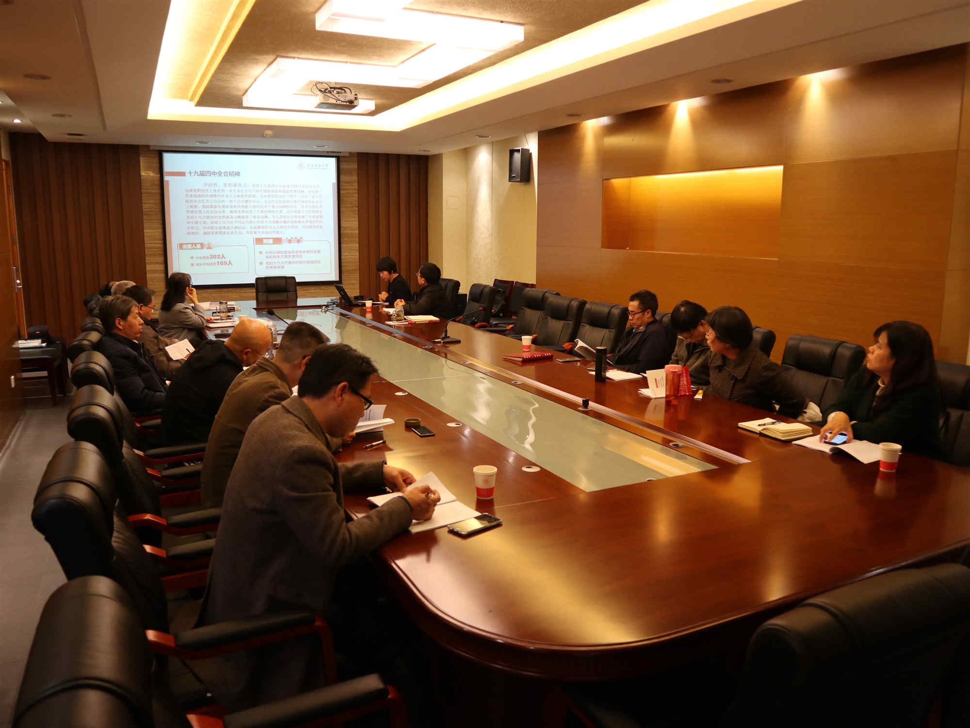 杜海斌为参会人员作了关于十九届四中全会精神的专题党课。她详细介绍了十九届四中全会的会议内容,解读了全会专题研究坚持和完善中国特色社会主义制度、推进国家治理体系和治理能力现代化问题的重要举措,分析了《中共中央关于坚持和完善中国特色社会主义制度、推进国家治理体系和治理能力现代化若干重大问题的决定》的重大意义和丰富内涵。最后,杜海斌强调,学院党委上下要结合正在进行的“不忘初心、牢记使命”主题教育活动,组织各支部开展多种形式的学习活动,深刻学习领会十九届四中全会精神,在思想上紧跟党中央的步伐,在学习中提高思想觉悟,在实践中推动教学科研。