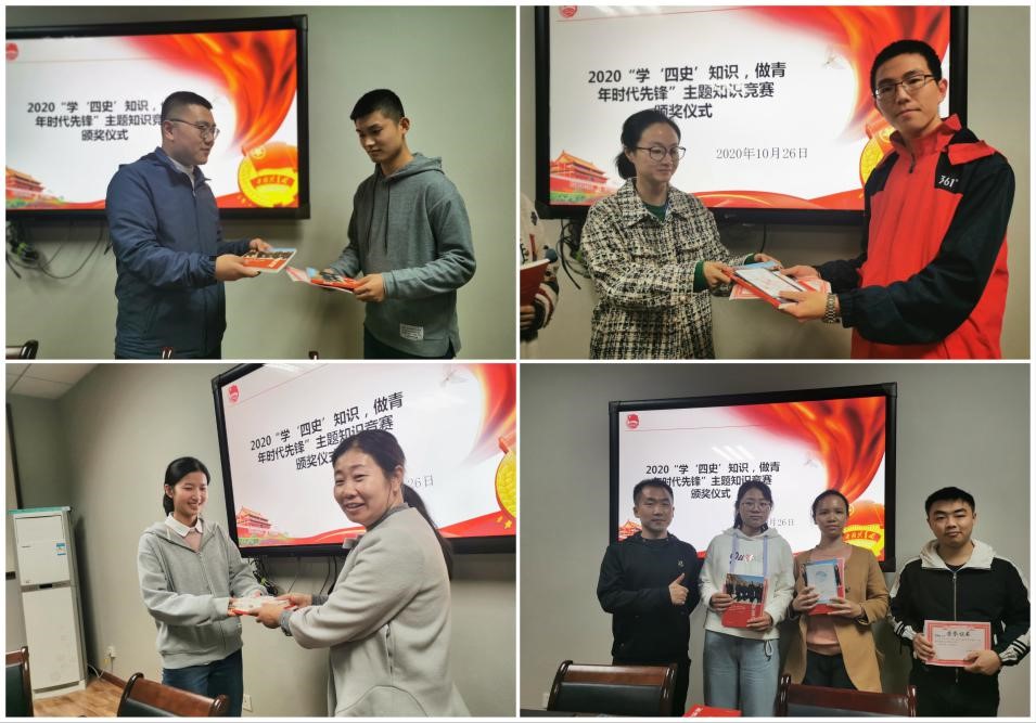10月26日晚7:00,学院团委在文汇楼C段217室举行2020年“学‘四史’知识,做青年时代先锋”主题知识竞赛活动颁奖仪式,学院团委书记洪海安、2019级本科生辅导员鲁旭萌以及研究生兼职辅导员李杰、唐金聚参会。洪海安对获奖同学提出了表扬,她讲到,青年一代应当对我国发展中国特色社会主义的实践史拥有更多的了解,希望同学们以此次“四史”主题知识竞赛为契机,进一步坚定理想信念,强化爱国意识,牢记初心使命,要学深悟透“四史”知识及其历史价值,并将之积极践行于日常学习生活之中。
