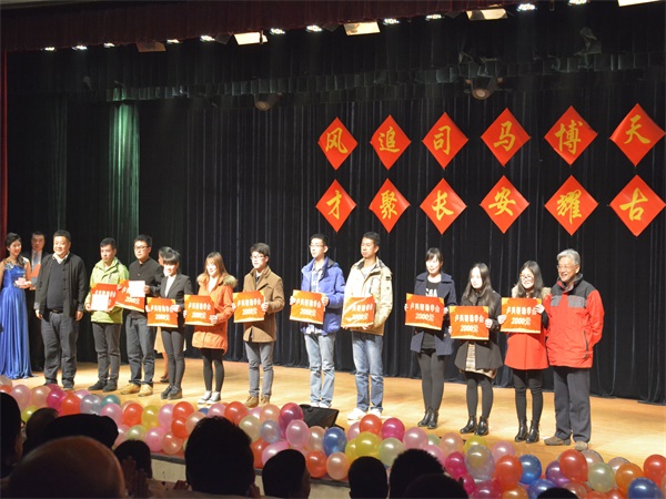 晚会开场前,暖场PPT展示了各位师生在2015年里工作和学习中所取得的成绩,累累硕果博得在场师生热烈掌声。随着青春活力的爵士舞《wish》,第二届历史剧展演正式拉开了帷幕。首先何志龙院长致新年贺词,何院长在对2015年我院工作进行总结的同时,又向各位师生送上了新年最诚挚的祝福。首先为大家献上的历史剧是由焦杰教授指导,我院校园性别文化研究会选送的历史剧《女人的身体,男人的目光》,她们通过展示由于各个时代男人审美的变化,而导致对女性造成的伤害,表达了女性要捍卫自己身体的强烈意愿。紧接着上场的是2013级历史一班的《荆轲刺秦》,同学们通过丰富的表现力再现几千年前那扣人心弦的激烈场面。随后晚会进入到第一个颁奖环节,赵世超教授和卢兴轩先生为荣获卢兴轩奖助学金的同学颁发获奖证书,并对他们的学习提出了期许。随后,周晓薇教授、校党委学工部部长学生处处长刘建军、校团委书记鲁镇、研工部副部长宋传东为获得陕西师范大学第三届中国古典文献学专业奖学金的同学颁发获奖证书。