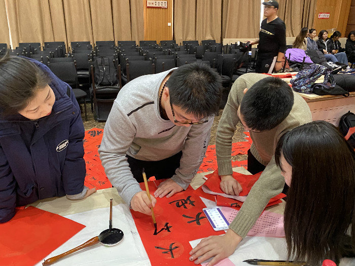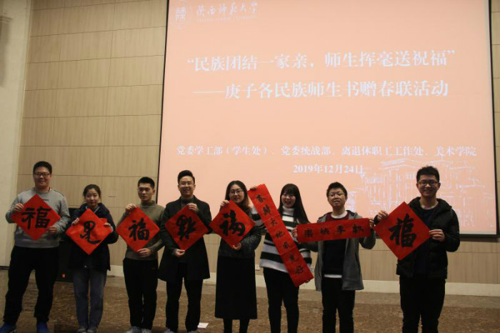 随着党委常委、统战部部长罗永辉宣布:陕西师范大学“民族团结一家亲,师生挥毫送祝福”——庚子各民族师生书赠春联活动开笔,现场气氛顿时欢腾起来。我院师生代表们热情洋溢,纷纷摊纸研墨,案牍纸前翰墨飘香。活动后,大家互送“福”字和春联表达新年祝福。