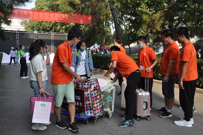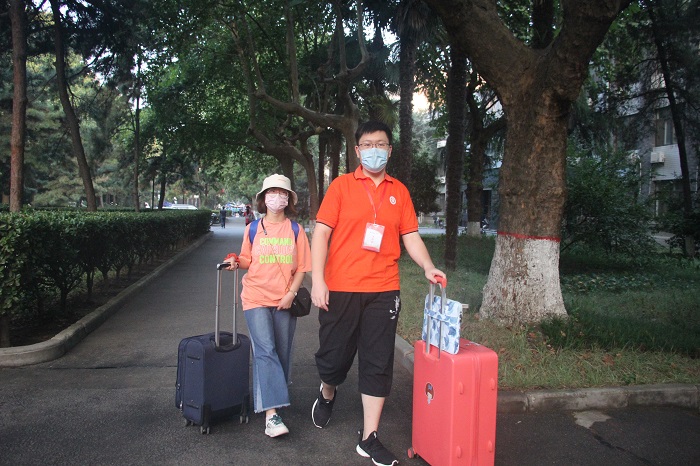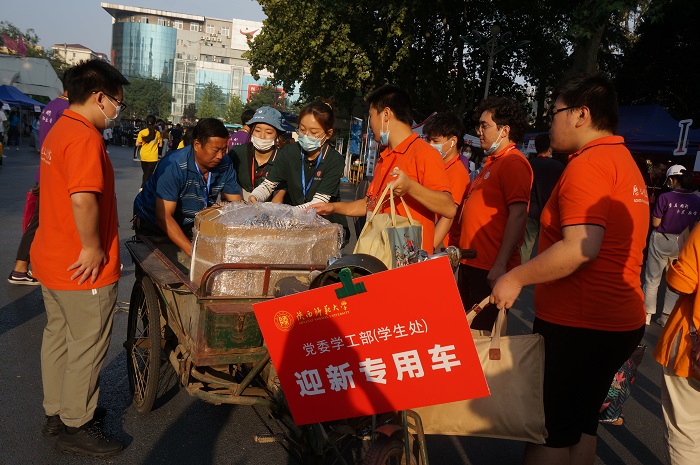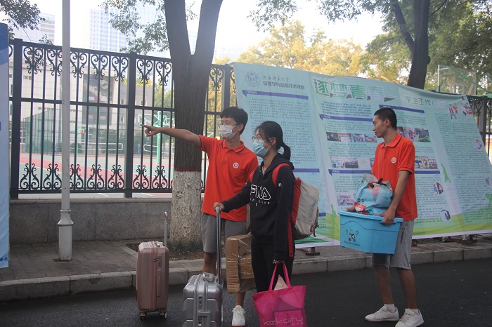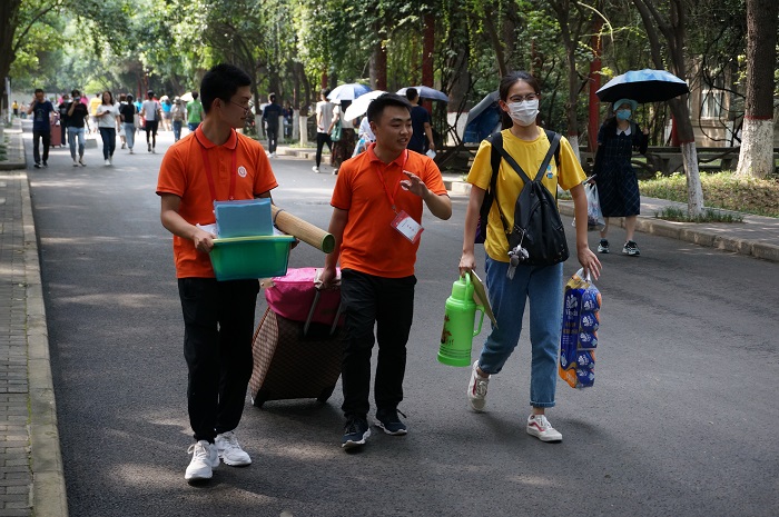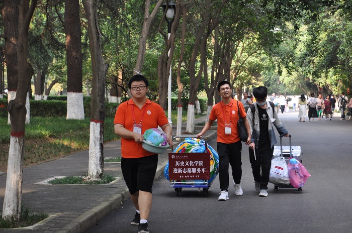 由30余名男生志愿者组成迎新志愿服务队,在校门口引导新生进校并帮助搬运行李至寝室。在行走的路途中,各位经验丰富的学长,用不同的语言风格和不同的表达方式,为新同学们介绍古典幽静的雁塔校区校园环境,带领大家初识期待已久的大学生活。
