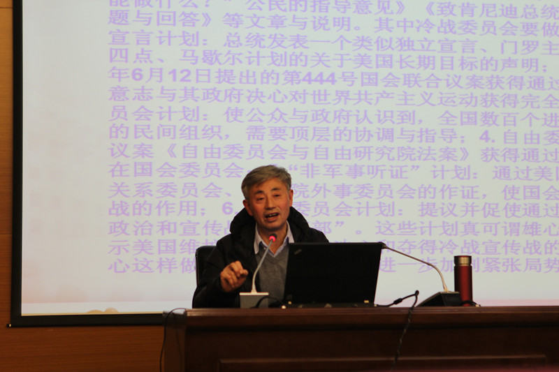 杜海斌书记简短介绍了白建才教授基本情况后,白建才教授围绕亨利·迈耶斯的政治活动及其所造成的影响讲述了四个方面的内容,分别是:“亨利·迈耶斯及其冷战委员会的成立”、“亨利·迈耶斯与冷战委员会的活动”、“亨利·迈耶斯及其冷战委员会活动的效果与影响”及“美国民间冷战斗士的缩影”。白建才教授对亨利·迈耶斯的生平与早期政治活动进行介绍,指出亨利·迈耶斯最重要的政治活动是成立了一个民间组织——“冷战委员会”,此组织的目的是鼓励和促进美国在全世界参与对抗共产主义的宣传作战时主动出击,宣扬共产主义的扩张及对美国的威胁,动员人民支持冷战,帮助美国在全世界与共产主义进行对抗。