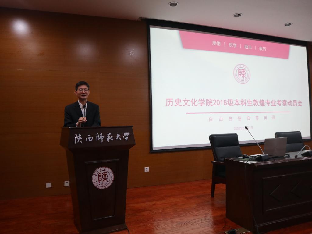 2020年11月3日晚,我院于文汇楼c段211报告厅成功举办2018级本科生敦煌考察动员会。本次动员会由我院副院长郭艳利主持,院长何志龙,党委副书记程蕾,带队教师代表韩中义、冯立君、2018级辅导员刘旭辉、靳雅娜、2018级全体本科生参加了此次动员大会。