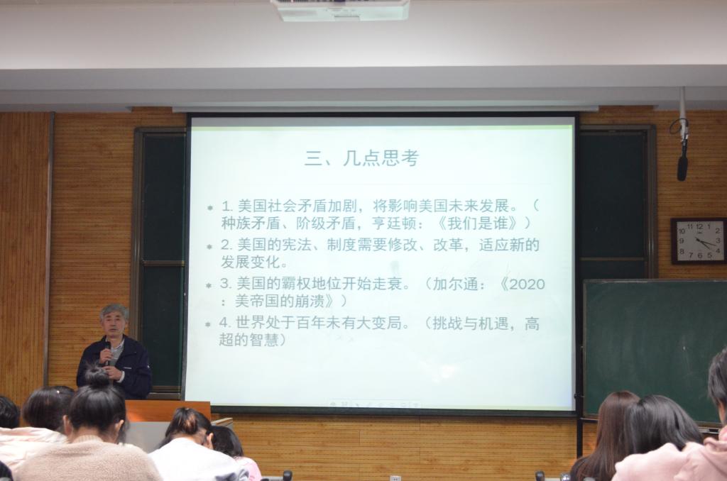 首先,白建才教授就美国疫情、大选以及“BLM”运动的原因做了详细阐述。在讲解过程中,他列举了大量的数字,展示了许多相关的图片,播放了纪录片,并且讲述了自己疫情期间在美国的亲身经历,充分地调动了各位同学的热情和听讲的积极性。 白建才还评估了这三件大事可能会对美国带来什么影响。最后,白建才结合未来世界发展趋势和美国的现实情况提出了几点思考。他还指出,中国将会秉持一贯的外交原则,处理好中美关系,顺应和平与发展的时代主题。