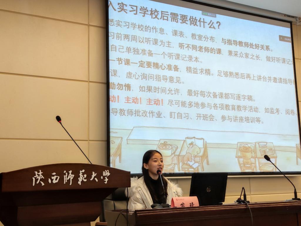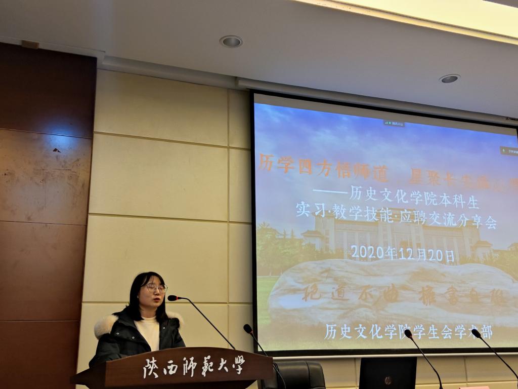 2017级历史学卓越教师实验班的苗琦首先为大家进行分享。她结合自身教育实习与求职经历,从实习学校的选择、实习期间注意事项及个人简历制作、学校招聘的选拔方式等方面与大家进行分享交流。苗琦学姐希望大家放平心态,不惧第一次应聘的失败,努力提升自己。
