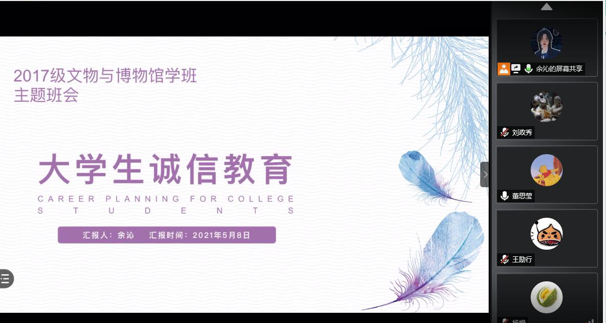 5月8日下午,2017级文博班在线上开展了大学生诚信教育主题班会活动。本次活动由班长余沁主持,文博班全体成员参与。