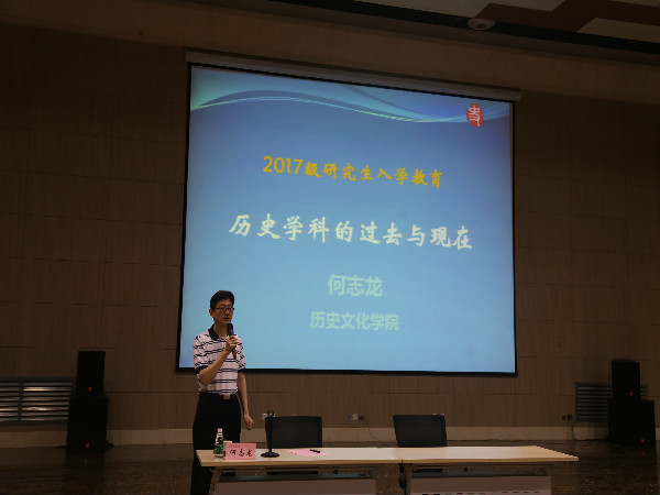 经过短暂休息后,院长何志龙给研究生进行入学教育第一讲,报告题目为《历史学科的过去和现在》。首先,何院长梳理了陕西师范大学的校史及威廉williamhill体育的发展历程与机构建制,并介绍了学院一批享誉学林的著名学者。接下来,他指出威廉williamhill体育遵循求是与致用并重的建设思路, 针对国家推进高校“双一流”建设的发展契机,他指出,在当前的学科发展背景下,平台建设已基本完成,内涵发展将成为今后学科建设的重点。因此学院的发展应以学科平台为基础,以师资队伍为核心,以学科特色为关键,以国际化和学科交叉为动力,遵循“扶强育优、有序推进、重点突破、协调发展”的学科建设原则,凝练西安地域特色,构建和谐奋进的学院文化,在“自由、自信、自尊、自强”理念的引领下,为实现“西部领先、国内一流”研究型学院的发展目标,扬帆远航,奋勇前行。