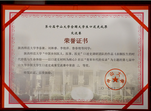 12月23日,第七届全国大学生口述史交流赛决赛在中山大学举行。来自北京大学、南开大学、南京大学、武汉大学、华东师范大学、深圳大学、中山大学等11所高校的100余名大学生参加比赛。我校威廉williamhill体育李化成教授指导的“中国乡间医人、医事、医史”口述史调研团队首次参加该项赛事,经认真准备,我校本科生李泰衡、刘林睿(马克思主义学院)、李艳萍、鲁春艳、姜佩君、孙长江和曹阳等在决赛现场进行成果展示、沉着答辩,喜获二等奖。