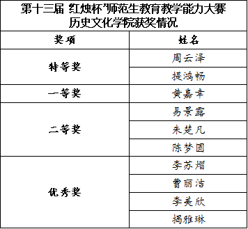 在大赛过程中,我院高度重视并积极组织备赛,学院历史教育学学科带头人徐赐成教授、历史学科教学论专业教师蔡娜副教授、学院教学副院长郭响宏副教授全程指导学生备赛。经过“学院初赛-校级复赛-校级决赛”三个环节,在学院的周密谋划组织、专业教师的悉心指导、参赛同学的精心准备下,参赛选手们不断完善教学设计,规范教学流程,取得了优异的成绩。最终,我院周云泽、提鸿畅两位同学获特等奖,黄嘉幸同学获一等奖,易景露、朱楚凡、陈梦圆三位同学获二等奖,李苏熠、曹丽洁、李美欣、揭雅琳四位同学获优秀奖。
