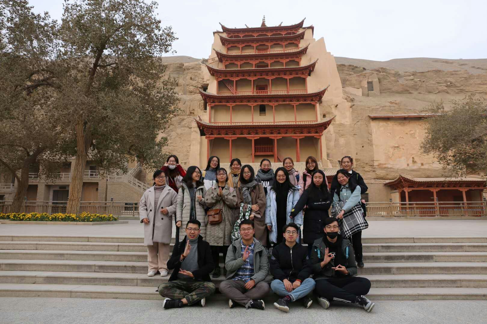 西千佛洞因地处敦煌之西而得名,现存洞窟16个,开凿时期横跨北魏至隋唐。在讲解员的带领下,同学们感慨于佛像壁画的精美,并认真聆听记录,展开提问与讨论。敦煌博物馆的展览分为莫高窟藏经洞文书展、敦煌发展历史及汉至唐时期墓葬出土文物展、丝绸等,通过对博物馆的参观学习,大家对敦煌的历史文化变迁有了更深入的了解,为接下来的莫高窟考察奠定了基础。而鸣沙山一处的参观,让同学们更加深入体验了敦煌的风土人情,从而对此地有了更深的敬意和热爱。