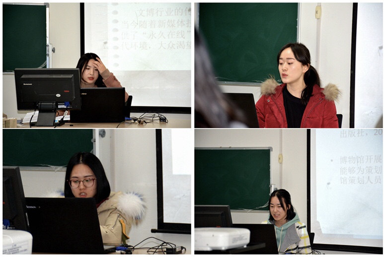 本次论坛分为两个小组,即文博组与考古组,采取学生PPT演讲与老师评议相结合的方式。文博组由冀佳颖、焦冠钊、汪贵元、赵维娜、范丹妮、刘妍钧、王娅、乌德宝丽8人组成,分别就博物馆目前在陈列展览、研学旅行、教育体验项目、残障人士服务、文创产品开发与设计、纸质文物保存现状、文化遗产发展、文化资源开发等问题进行探讨。