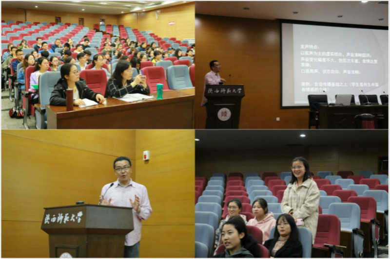 第二讲特邀我校新闻与传播学院何明家老师主讲,何老师开场即点明了作为老师保护好嗓子的重要性,如何正确开声亮嗓也是作为教师的基本功之一。讲座现场,何老师为大家亲身示范,展示正确的呼吸方式配合发声效果。同时组织现场同学以朗诵古诗词的方式在实践中体会发声技巧、锻炼发音技能。