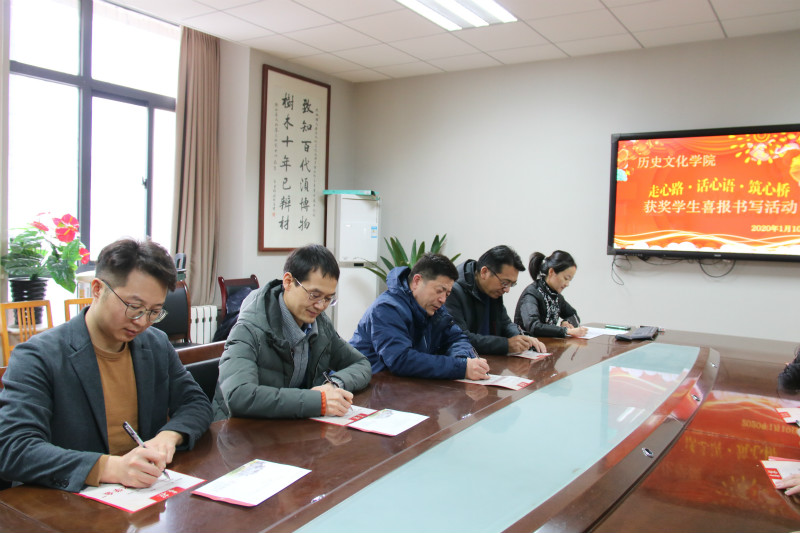 2020年1月10日下午,在文汇楼c段217会议室进行2019年寒假喜报书写活动。威廉williamhill体育本科生班主任代表、专业教师张文安,田武雄,吕亚虎,杨松,2019级辅导员鲁旭萌,2017级辅导员师瑞青,研究生辅导员张兴浩以及多位学生代表一同为获奖学生书写喜报。