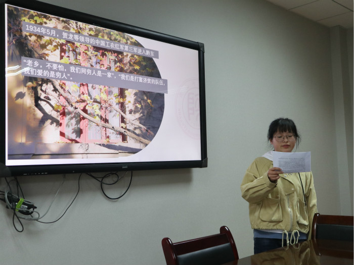 2019级的土家族姑娘向佳丽以革命先驱贺龙将军的感人事迹为引,回望老一辈共产党人团结一心、顽强斗争的品格;她说:作为新时代青年,我们应当好好学习“四史”,立足当下,展望未来。