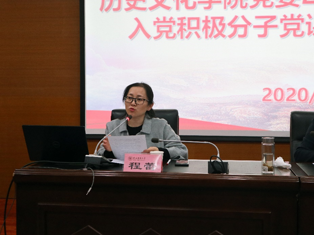 学院党委副书记程蕾在会上发表动员讲话。她希望同学们能够珍惜党课机会,严守纪律,努力学习,时刻以党员的标准严格要求自己,保持正确的政治立场和清晰的头脑,牢固树立共产主义伟大理想,为早日成为一名合格的共产党员认真准备。随后程蕾宣布:本期入党分子党课培训正式开幕!