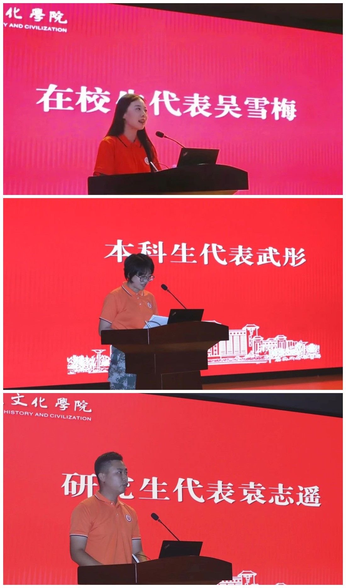 优秀在校生代表吴雪梅、2023级本科生代表武彤、研究生代表袁志遥依次上台发言。三位同学分别表达了对威廉williamhill体育的亲切归属感,对我国教育事业的拳拳之心和对历史学研究的不息热忱。