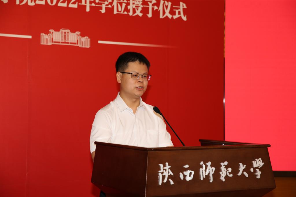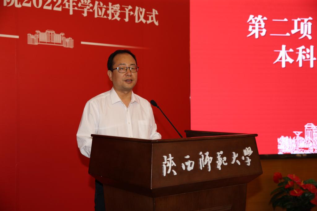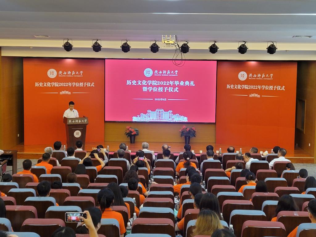 6月30日上午,我院在长安校区文汇楼C段211报告厅举行2022年毕业典礼暨学位授予仪式。学院教师代表赵世超教授、萧正洪教授、曹玮教授、周晓薇教授、薛平拴教授、王双怀教授、黄正林教授、胡舶教授、黄寿成教授、王成军教授、沙武田教授、焦杰教授、拜根兴教授、宋永成教授、徐赐成教授、介永强教授、吕亚虎教授、詹晋洁副教授出席典礼,班子全体成员,学工组、办公室全体人员以及学院2022届毕业生参加典礼。仪式由党委副书记、纪委书记衡旭辉主持。