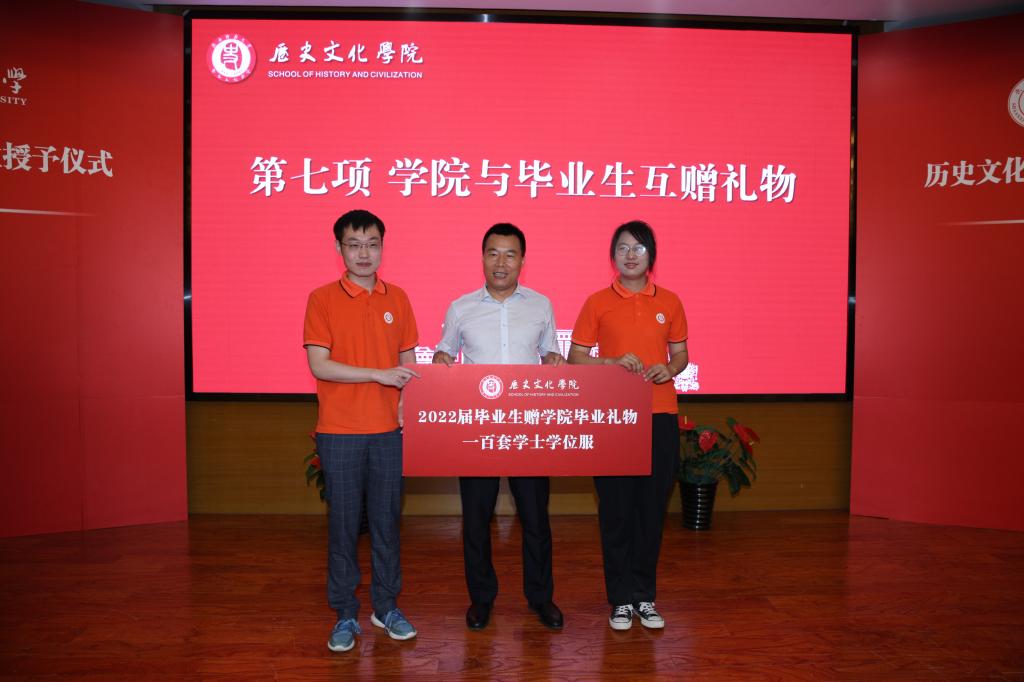 师恩难忘意深浓,桃李人间茂万丛。临别之际,学院为毕业生们准备了一份独特的赠礼——“红烛铭”纪念册。党委组织员、团委书记孙懿文做“红烛铭”发布,教师代表为2022届本硕博毕业生代表赠送“红烛铭”纪念册。党委书记孙伟代表学院接受毕业生礼物--一百套学士服。