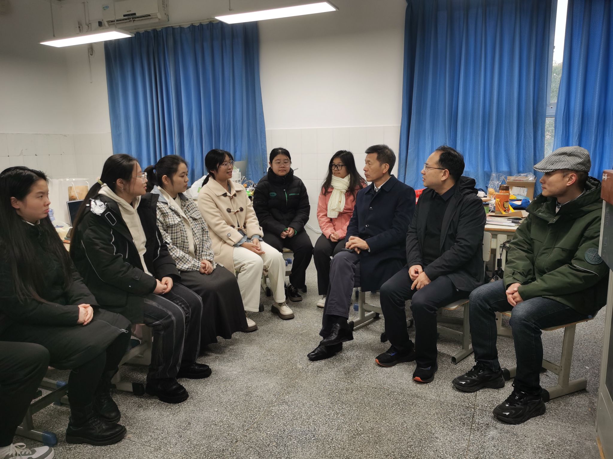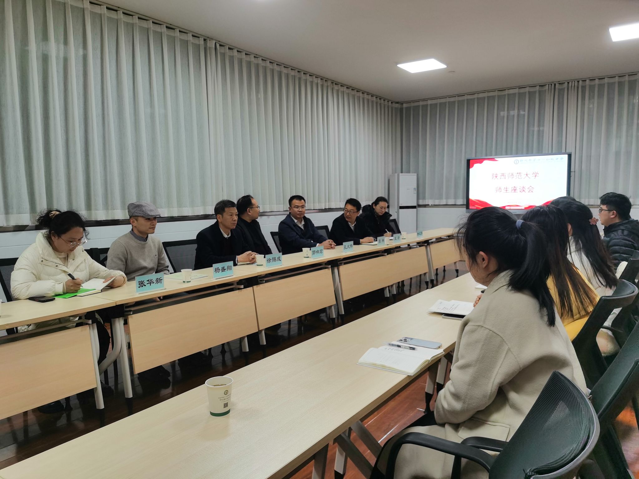 在郑州十一中,校长孔大伟、副校长张林,教务主任张华新、办公室主任王岩和德育主任黄延涛向郭响宏一行详细介绍了十一中指导实习生开展教学实习和班主任见习工作的具体做法,并向实习生提出了未来职业生涯规划的具体建议。孔大伟校长还表达了继续与陕西师范大学深化合作,开拓实习、教研一体化及互动交流新渠道的想法。徐赐成教授在发言中感谢十一中为陕师大学子提供的优质实习平台,希望实习生珍惜机会,在体验中成长,在反思中进步。郭响宏副院长在发言中感谢十一中从实习方案制定、实习指导老师配备、见习班主任指导等方面为实习生提供的帮助和支持,更感谢实习学校为实习生就业和职业生涯规划方面提供的指导,希望双方以此次实习为契机,进一步深化合作领域,拓宽合作范围,共同推动师范生培养质量的提升和十一中教育教学质量的进一步发展。