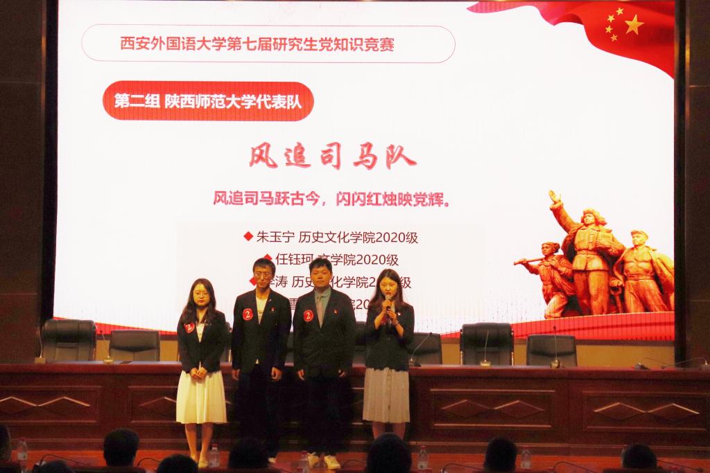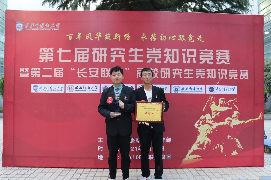 5月12日下午,“百年风华筑新路 永葆初心跟党走”第七届研究生党知识竞赛暨第二届“长安联盟”高校研究生党知识竞赛在西安外国语大学长安校区SA105模联会议室举行。我院2020级中国近现代史硕士研究生朱玉宁和李涛代表学校参赛。经过激烈角逐,我校风追司马队获得党史知识竞赛第二名的好成绩!