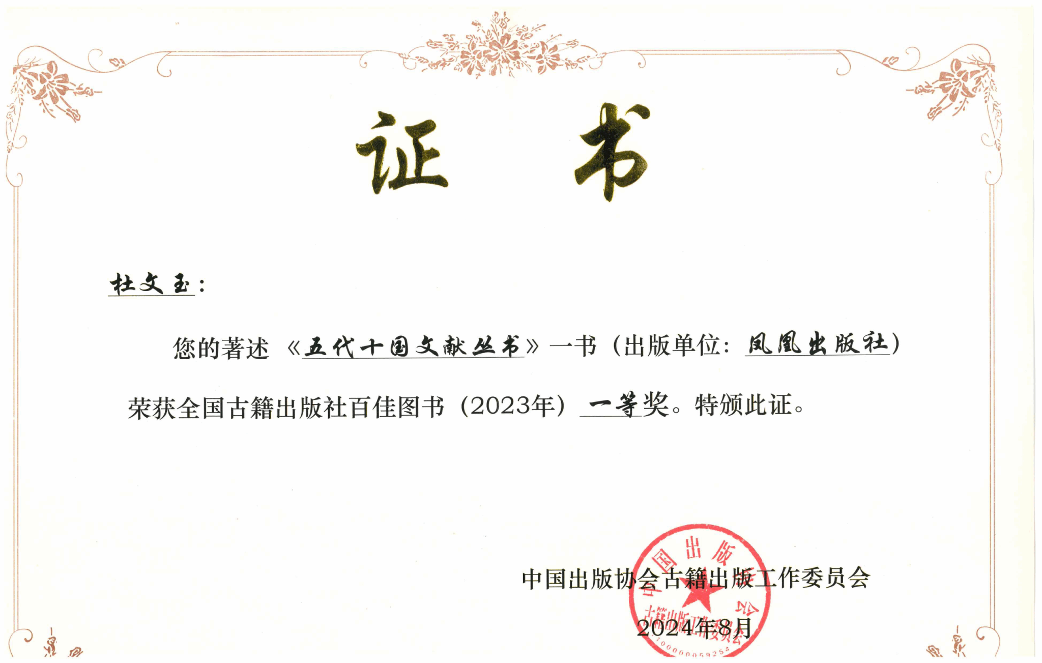 会议期间,古工委组织开展2023年度全国古籍出版社百佳图书推荐工作。本次推荐工作共收集图书307种,其中古籍类图书255种、普及读物类图书52种。我院杜文玉教授主编《五代十国文献丛书》荣获全国古籍出版社百佳图书(2023年)一等奖。