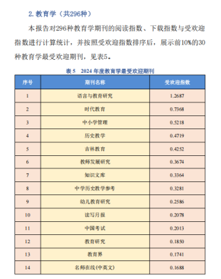 本次报告对296种教育学刊物的阅读指数、下载指数与受欢迎指数进行统计,并按照受欢迎指数排序后,展示前10%的30种教育学最受欢迎期刊。《中学历史教学参考》荣获国家哲学社会科学文献中心2024年度教育学最受欢迎期刊。