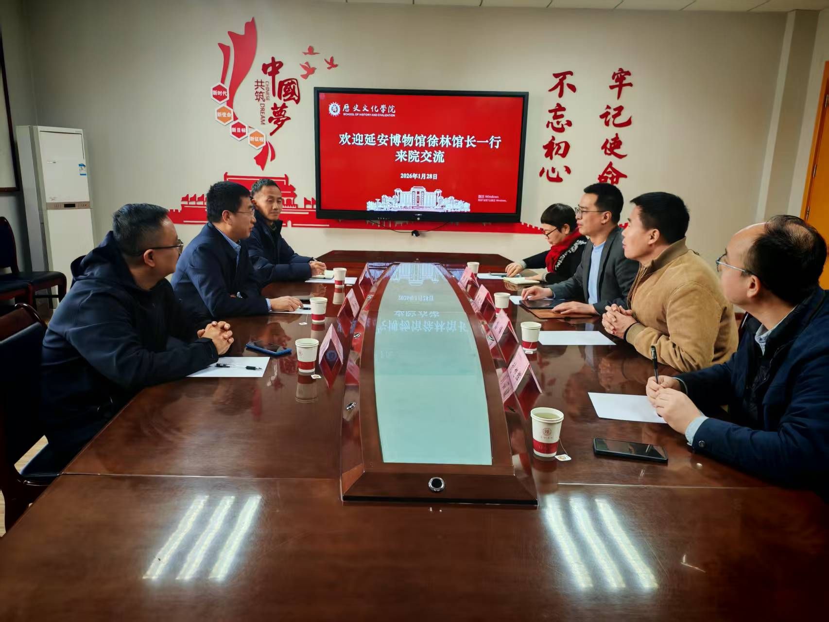2026年1月28日,延安博物馆徐林馆长、编研部负责人崔元成、办公室项目负责人刘少帅一行到访学院,进行工作交流。学院党委书记孙伟、副院长刘旭辉及杨瑾教授等参加了座谈,院长李化成主持会议。